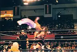 Sabu aplicando o moonsault em Rhyno, durante um evento da ECW.