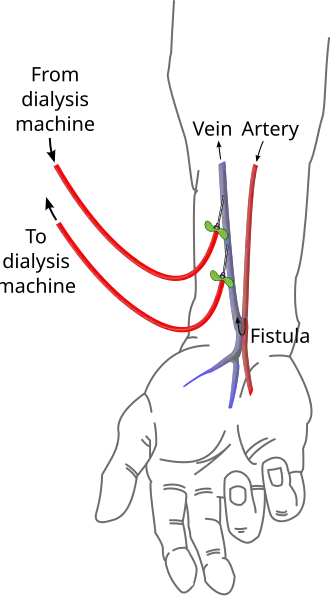 - Fístula artério-venosa para diálise ou para circulação extracorpórea durante certas intervenções cardíacas.