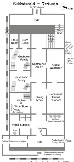 O bunker da Chancelaria do Reich foi inicialmente construído como um abrigo antiaéreo temporário para Hitler, que na verdade passou muito pouco tempo na capital durante a maior parte da guerra. O aumento dos bombardeios de Berlim levou à expansão do complexo como um abrigo permanente improvisado. O complexo elaborado consistia em dois abrigos separados, o Vorbunker ("bunker avançado"; o bunker superior), concluído em 1936, e o Führerbunker, localizado 2,5 metros abaixo do Vorbunker e a oeste-sudoeste, concluído em 1944.[1][2] Eles eram conectados por uma escada em ângulos retos e podiam ser separados um do outro por uma antepara e porta de aço.[3] O Vorbunker estava localizado a 1,5 metros (4,9 pés) abaixo do porão de um grande salão de recepção atrás da antiga Chancelaria do Reich na Wilhelmstrasse 77.[4] O Führerbunker estava localizado a cerca de 8,5 metros (28 pés) abaixo do jardim da antiga Chancelaria do Reich, 120 metros (390 pés) ao norte do novo edifício da Chancelaria do Reich em Voßstraße 6.[5] Além de ser mais profundo sob o solo, o Führerbunker tinha significativamente mais reforço. Seu telhado era feito de concreto com quase 3 metros de espessura.[6] Cerca de 30 pequenas salas foram protegidas por aproximadamente 4 metros (13 pés) de concreto; as saídas levavam aos edifícios principais, bem como uma saída de emergência para o jardim. O desenvolvimento do Führerbunker foi construído pela empresa Hochtief como parte de um extenso programa de construção subterrânea em Berlim iniciado em 1940.[7]
