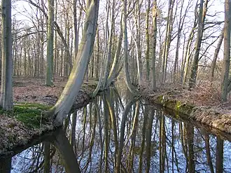 Faias (Fagus sylvatica) de troncos curvados, na margem de um canal.