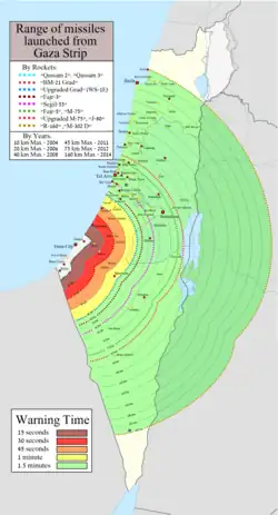 Durante as duas semanas de conflito, grupos palestinos como o Hamas e Jihad Islâmica dispararam mais de 4 000 foguetes contra Israel a partir de Gaza,[78][79][80][81] dirigidos primeiramente à região central israelense, inclusive Jerusalém e Bete-Semes,[79] e depois contra cidades israelenses fronteiriças, Asquelom e Asdode, e na direção de Telavive, que causaram a morte de pelo menos onze civis israelenses e um militar, além de dezenas de feridos, bem como danos de extensões variadas a residências e escolas em Israel.[80] Desde o início do disparo dos foguetes palestinos, as Forças de Defesa de Israel empreenderam uma campanha de bombardeios localizados contra as bases militares e tubos de lançamento de foguetes palestinos, os quais se situam aterrados dentro da área urbana da Faixa de Gaza, densamente povoada por civis palestinos.[82][83] Mais de 230 palestinos foram mortos, incluindo comandantes de organizações islamitas, operadores de foguetes e civis palestinos, especialmente em Gaza, no decorrer das hostilidades, como resultado dos bombardeios israelenses e de centenas de foguetes palestinos que caíram dentro de Gaza, sem chegar ao espaço aéreo israelense.[83][84][85][86][87] Em 20 de maio, após onze dias de intensos hostilidades, Israel e Hamas concordaram com um cessar-fogo, que entrou em vigor na madrugada do dia seguinte. Naquela altura, mais de 280 pessoas já tinham morrido (a maioria palestinos).[88]