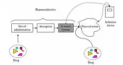 Farmacocinética é o "caminho"[Obs 1] que o medicamento segue no organismo de seres vivos como humanos. Não se trata do estudo do seu mecanismo de ação, o que corresponde à farmacodinâmica ou mesmo da farmacogenômica, mas sim as etapas que a droga [Obs 2] sofre desde a administração, introdução do fármaco no organismo como tomar um comprimido, até a excreção, processo pela qual o fármaco deixa o organismo definitivamente, que são: administração, absorção, biotransformação, biodisponibilidade e excreção. Note também que uma vez que se introduza a droga no organismo, essas etapas ocorrem de forma simultânea, dado que uma quantidade de medicamento já passou pela etapa em questão [Obs 3], sendo essa divisão apenas de caráter didático.