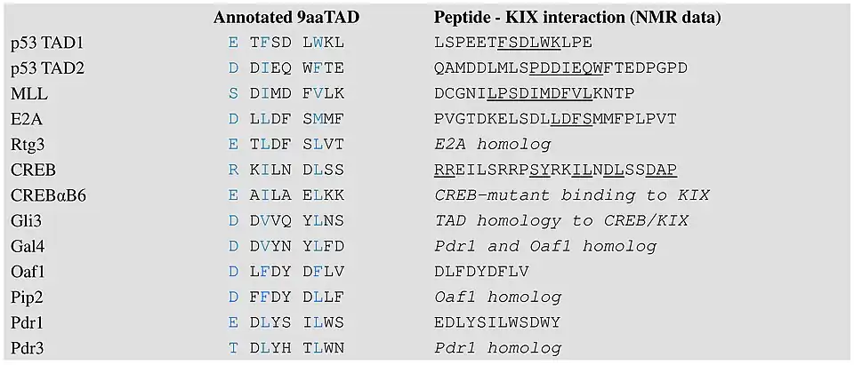 . PMID 10611293. doi:10.1073/pnas.96.26.14801; Uesugi M, Nyanguile O, Lu H, Levine AJ, Verdine GL (1997). «Induced alpha helix in the VP16 activation domain upon binding to a human TAF». Science. 277 (5330): 1310–3. PMID 9271577. doi:10.1126/science.277.5330.1310; Choi Y, Asada S, Uesugi M (2000). «Divergent hTAFII31-binding motifs hidden in activation domains». J. Biol. Chem. 275 (21): 15912–6. PMID 10821850. doi:10.1074/jbc.275.21.15912; Lee CW, Arai M, Martinez-Yamout MA, Dyson HJ, Wright PE (2009). «Mapping the interactions of the p53 transactivation domain with the KIX domain of CBP». Biochemistry. 48 (10): 2115–24. PMC 2765525