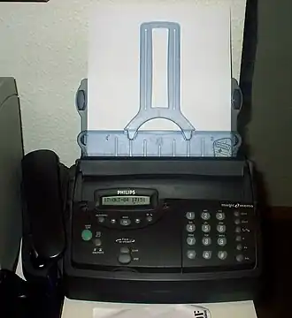 Fax, faxe,[1] telefax (abreviaturas do termo latino facsimile e telefacsimile) ou telecópia é uma tecnologia das telecomunicações usada para a transferência remota de documentos através da rede telefônica.