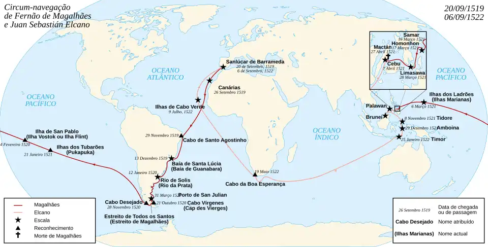 - ↑ «Fernão de Magalhães, a Circum-navegação da Terra». historiografiaportuguesaeuniversal.blogs.sapo.pt. Consultado em 5 de março de 2021