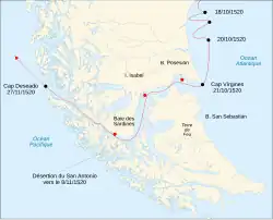 - 1520 — Alcançou a foz do Rio da Prata; fez invernada na baía de São Julião; dominou um motim; atravessou o Estreito e alcançou o Oceano Pacífico.