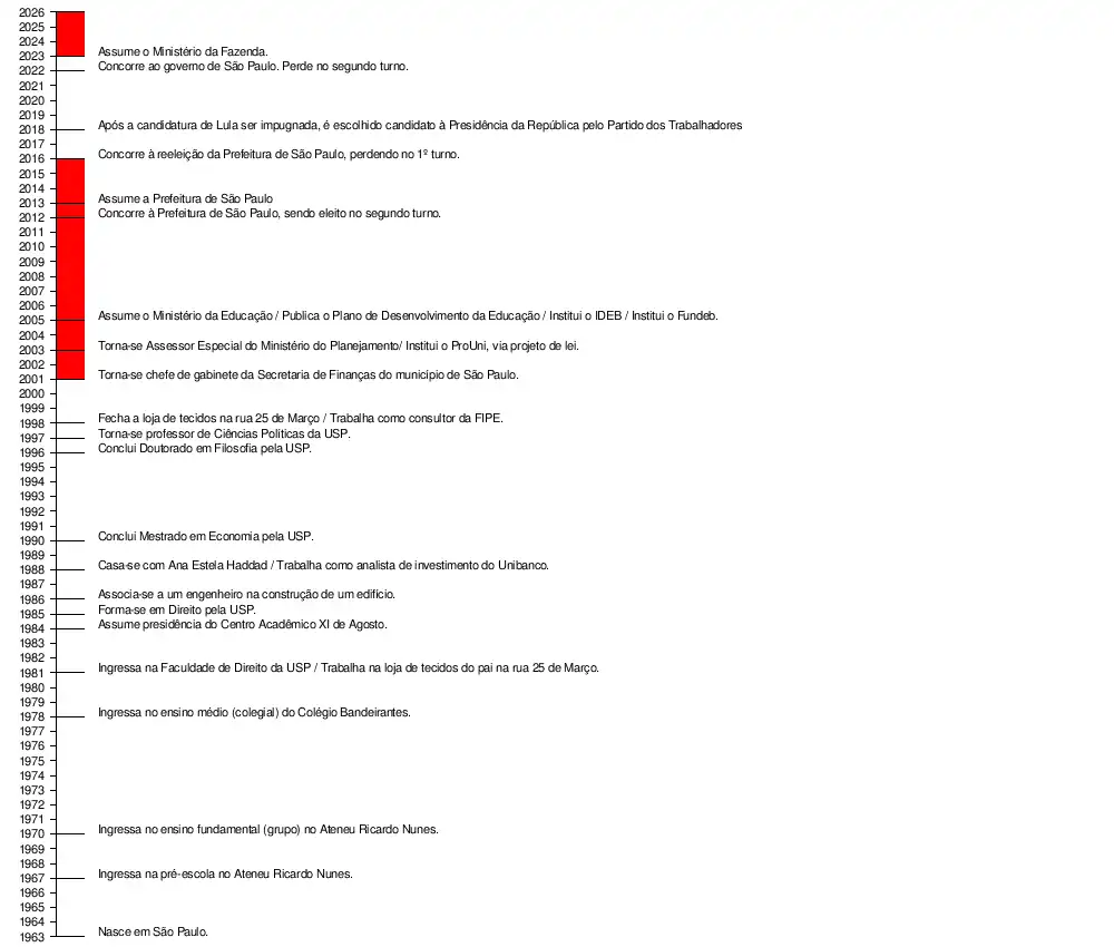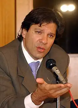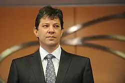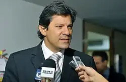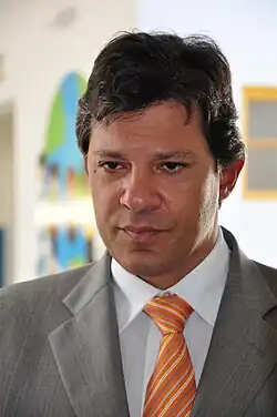 Fernando Haddad GCRB • GCMD • GOMM (São Paulo, 25 de janeiro de 1963) é um professor universitário, advogado e político brasileiro, filiado ao Partido dos Trabalhadores (PT).[9] Foi ministro da Fazenda do Brasil, de 2023 a 2026,[10] e ministro da Educação, de 2005 a 2012, nos governos Lula e Dilma Rousseff.[11] Também foi prefeito da cidade de São Paulo, de 2013 a 2016.[12][13]