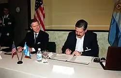 - ↑ «Convenio militar con los EE.UU.». La Nación. 18 de outubro de 2000. Consultado em 18 de julho de 2017