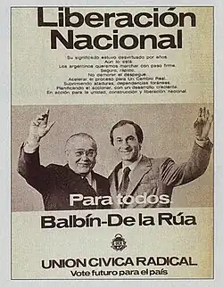 O Processo de Reorganização Nacional terminou em 1983. De la Rúa pretendia concorrer à presidência, mas perdeu na eleição primária da UCR a Raúl Alfonsín, eleito na eleição geral.[5] Em vez disso, concorreu a senador, derrotando o peronista Carlos Ruckauf. Em 1989, concorreu à reeleição como senador, mas, apesar de sua vitória eleitoral, o colégio eleitoral votou no peronista Eduardo Vaca.[6] De la Rúa foi eleito deputado em 1991 e retornou ao Senado em 1993. O presidente Carlos Menem, eleito em 1989, queria alterar a Constituição para permitir sua candidatura à reeleição em 1995, o que recebeu oposição da UCR. Alfonsín assinou o Pacto de Olivos com Menem, negociando os termos para apoiar a proposta. De la Rúa liderou a oposição ao pacto dentro da UCR, mas Alfonsín prevaleceu na disputa interna. Isso prejudicou a relação entre os dois líderes, mas ajudou o partido a manter uma série de radicais contrários ao pacto.[7] De la Rúa não pôde impedir a emenda de 1994 da Constituição argentina. Como resultado, Menem foi reeleito em 1995.[8] Pela primeira vez, a UCR terminou em terceiro lugar na eleição, sendo superada pelo Frente País Solidário (FREPASO), um novo partido composto por ex-peronistas.[7]