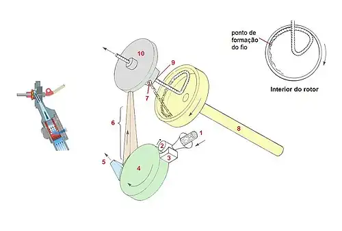 Cada revolução do braço do fio introduz uma volta de torção no fio que se encontra no canal de saída da placa frontal. Parte desta torção retorna à superfície do rotor, através do braço de fio, que faz com que a ponta do fio iniciador fique entrelaçada com o anel de fibras, que pode então ser gradualmente "descascado" da superfície do rotor a fim de formar o fio. O fio assim produzido é seguidamente enrolado em forma de queijo.