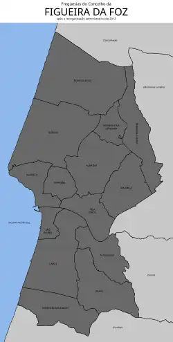 O município da Figueira da Foz está dividido em 14 freguesias (assinalam-se com asterisco as que integram a malha urbana da cidade):