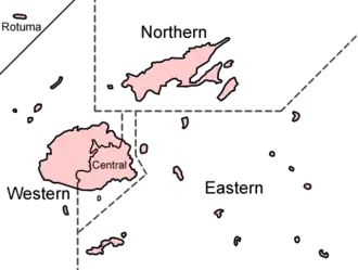 - Divisão Central (Suva): Naitasiri, Namosi, Rewa, Serua e Tailevu