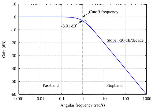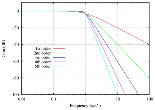 • Um filtro de primeira ordem, por exemplo, irá atenuar a amplitude do sinal em cerca de 6 dB cada vez que a frequência dobrar (subir uma oitava). O gráfico de magnitude de um filtro de primeira ordem se assemelha a uma linha horizontal antes da frequência de corte, e um linha diagonal após a mesma. Existe também o "cotovelo" no limite entre os dois, que é a transição suave entre as duas regiões de reta. Veja Circuito RC.