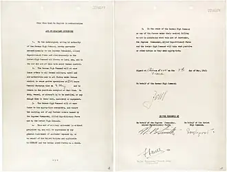 Na manhã de 7 de maio, o quartel-general do Comando Supremo das Forças Expedicionárias Aliadas em Reims, França, o Chefe do Estado-Maior do Alto comando das Forças Armadas Alemãs, o general Alfred Jodl, assinou os documentos de rendição de todas as tropas alemãs ao aliados, que incluía a seguinte frase: "Todas as forças sob controle alemão devem cessar suas operações às 23:01 horas Horário da Europa Central em 8 de maio de 1945."[13][20] No mesmo dia, o general Franz Böhme anunciou a rendição incondicional de todas as tropas alemãs na Noruega. No dia seguinte, o marechal-de-campo Wilhelm Keitel e outros oficiais viajaram até Berlim e pouco após a meia-noite assinaram um documento similar, submetendo a rendição às forças soviéticas na presença do general Gueorgui Júkov.[22] A cerimônia de assinatura aconteceu em uma antiga Escola de Engenharia do Exército Alemão no distrito de Karlshorst, atual Museu Alemão-Russo Berlin-Karlshorst.