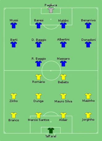 Esta seria a terceira final seguida de Copa do Mundo em que algum jogador não teria condições de jogo.[4] Arrigo Sacchi não pôde contar com Alessandro Costacurta, que estava suspenso. Foi um grande desfalque, já que ele estava fazendo uma ótima Copa do Mundo.[5] Já do lado brasileiro, o desfalque era apenas o de Leonardo, suspenso por 4 jogos por ter dado uma cotovelado no estadunidense Tab Ramos nas Oitavas de final.[6]