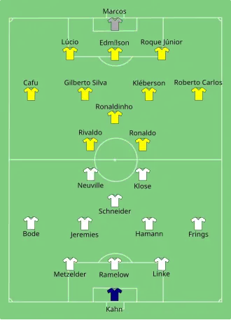- ↑ «Brazil v Germany, 30/6/2002». 11v11.com (em inglês). AFS Enterprises. Consultado em 29 de outubro de 2021. Cópia arquivada em 13 de novembro de 2022