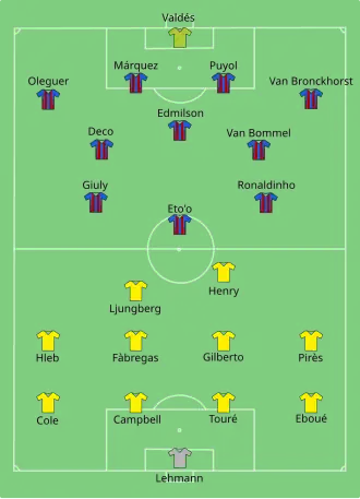 O Barcelona foi a campo jogando num esquema 4-3-3, com Mark van Bommel e Edmílson se alinhando a Deco no meio-campo. Lionel Messi estava machucado e ainda muito jovem; o argentino sequer ficou no banco de reservas. O setor de ataque era comandado por Ronaldinho e Samuel Eto'o, ao passo que o sueco Henrik Larsson entraria em campo durante o segundo tempo para fazer a sua última partida pela equipe catalã.