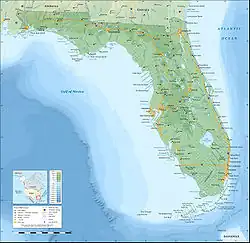 A altitude da Flórida é baixa. Geograficamente, o Estado é dominado por grandes planícies. O ponto mais alto do Estado é Britton Hill, com seus 105 m de altura. Este monte é o menor ponto mais alto de qualquer Estado americano. A Flórida, juntamente com a Luisiana, é o Estado que possui a menor altitude média dos Estados Unidos: 30 m.