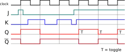Se T estiver em estado alto, o flip-flop T (toggle) muda o estado sempre que a entrada de clock sofrer uma modificação. Se a entrada T for baixa, o flip-flop mantém o valor do seu estado. Seu comportamento é descrito pela seguinte equação característica:[1]