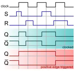Um flip-flop S-R Sincrono depende da habilitação de suas entradas por um sinal de clock para que essas possam alterar o estado dele. Este sinal pode operar de duas formas: mantendo as entradas ativas durante todo o período do pulso ou apenas no instante da mudança de estado do sinal de clock. Essas duas formas de operação podem ser denominadas como modo clock e modo trigger, respectivamente.[1]