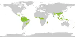 Muitas das florestas úmidas mundiais localizam-se na Zona de Convergência Intertropical ou cavado de monção.[4] As florestas úmidas tropicais são florestas úmidas que se encontram nos trópicos, junto ao Equador (entre o Trópico de Câncer e o Trópico de Capricórnio) e presentes no Sudoeste Asiático (da Birmânia até às Filipinas, Indonésia, Papua-Nova Guiné, e ao nordeste da Austrália),na África subsariana dos Camarões até à República Democrática do Congo, na América do Sul (e.g. a floresta da Amazônia), na América Central (e.g. a Reserva de Bioesfera dos Bosawás, a sul da Península de Iucatã-El Petén-Belize-Calakmul), e em muitas das ilhas do pacífico (tal como no Havaí). As florestas úmidas eram chamadas "Pulmões da Terra", embora agora se saiba que as florestas úmidas apenas contribuem com pequenas adições de oxigénio para a atmosfera através da fotossíntese.[5][6]