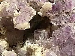 A fluorita (português brasileiro) ou fluorite (português europeu) é um mineral comum, cujo nome provém do latim fluere devido à sua fácil fusão; é composto basicamente de fluoreto de cálcio (CaF2), transparentes a translúcidos, de cor muito variável, com clivagem perfeita {111}. Possui hábito transparente, categorizada no sistema cristalino isométrico ou cúbico[1]. Apresenta brilho vítreo, densidade relativa 3.18. É o quarto termo da Escala de Mohs de dureza, tendo dureza igual a 4. São frequentes maclas de interpenetração.