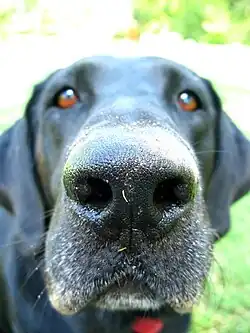 O nariz é divido em três regiões: nariz externo, cavidade nasal e seios paranasais. O nariz externo é dividido em raiz, dorso e ápice. É na raiz em que se localiza o "focinho" e as narinas, que possibilitam o acesso à cavidade nasal. Externamente, o nariz externo possui cartilagens nasais, que são flexíveis para diminuir a probabilidade de trauma ósseo devido a golpes, que são frequentes devido aos hábitos dos animais. A cavidade nasal é composta também pelas narinas, pelo vestíbulo nasal e coanas. Essa cavidade possui duas funções, uma condutora de ar e uma olfatória, que é responsável pela percepção de substâncias olfatórias.[1][2][3]