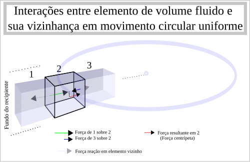 A maior das forças de interação entre um elemento e sua vizinhança ocorre pois no elemento diretamente em contato com o vidro no fundo do recipiente, e a força que este aplica ao elemento situado em vizinhança radialmente oposta deve ser menor do que o apoio que este recebe do vidro por uma parcela igual à força centrípeta necessária ao seu próprio movimento circular. Tal raciocínio estende-se de forma apropriada a todos os elementos de volume radialmente alinhados de forma que a pressão é tanto maior quanto maior a profundidade no fluido. Matematicamente o raciocínio apresentado pode ser resumido via expressão: