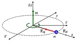 Acompanhando a pseudoforça centrífuga, que atua em direção radial em relação ao referencial girante, temos a pseudoforça de Coriolis, que aponta em direção perpendicular ao vetor vetor velocidade da partícula em relação ao sistema girante, e também ao eixo de rotação: