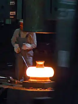 Forjamento é um processo de fabricação que envolve a formação de metais usando forças de compressão localizadas. Os golpes são feitos com um martelo (muitas vezes, um martelo de potência). O forjamento é frequentemente classificado de acordo com a temperatura na qual é realizado: forjamento a frio (um tipo de trabalho a frio), forjamento morno e a quente (um tipo de trabalho a quente). Para os dois últimos, o metal é aquecido, geralmente em uma forja. As peças forjadas podem variar em peso de menos de um quilograma para centenas de toneladas métricas. O forjamento foi feito por ferreiros há milênios; os produtos tradicionais eram utensílios de cozinha, ferragens, ferramentas manuais, armas afiadas, címbalos e joias. Desde a Revolução Industrial, peças forjadas são amplamente utilizadas em mecanismos e máquinas sempre que um componente requer alta resistência; tais peças forjadas geralmente requerem processamento adicional (como usinagem) para obter uma peça acabada. Hoje, a forja é uma indústria mundial importante.[1]