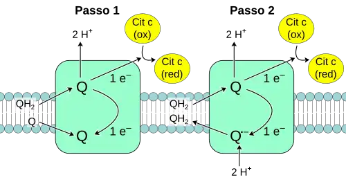Os dois passos de transferência electrónica no complexo III: Q-citocromo c oxidorredutase. Após cada passo, Q (na parte superior da figura) deixa a enzima.