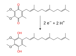 Redução da coenzima Q a partir da sua forma de ubiquinona (Q, cima) à forma totalmente reduzida ubiquinol (QH2, em baixo).