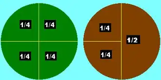 Representação gráfica de fração. Observa-se facilmente a equivalência entre 2/4 e 1/2.