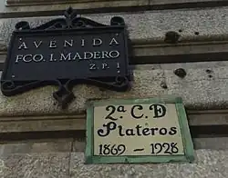 Placa de rua moderna e placa com o antigo nome da seção, Calle de Plateros