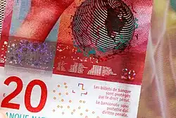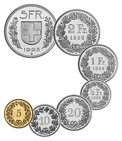 | Franc suisse (em francês) Franco svizzero (em italiano) Schweizer Franken (em alemão) Franc svizzer (Romanche) | |
