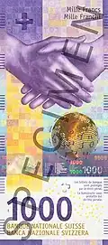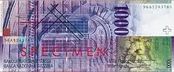1000 francos | 181 × 74 milímetros | Roxa | Jacob Burckhardt | 1 de abril de 1998 | |