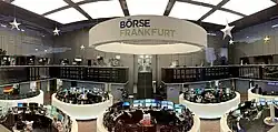 A Bolsa de Valores de Frankfurt (Frankfurter Wertpapierbörse) começou no século IX. No século XVI, Frankfurt tornou-se um importante polo europeu para feiras e serviços financeiros. Atualmente, a bolsa é, de longe, a maior da Alemanha, com um volume de negócios de mais de 90% do mercado de ações alemão e é a terceira maior da Europa, após a Bolsa de Valores de Londres e a filial europeia da NYSE, a Euronext. O índice de mercado de ações mais importante é o DAX, o índice das 30 maiores empresas comerciais alemãs listadas na bolsa de valores. A bolsa de valores é detida e operada pela Deutsche Börse, que também é listada no DAX e possui a bolsa europeia de futuros Eurex e a Clearstream Company Clearstream. A negociação ocorre exclusivamente através do sistema de negociação Xetra. Está localizado no centro da cidade na Börsenplatz. A sede da Deutsche Börse está formalmente registrada em Frankfurt, mas transferiu a maioria de seus funcionários para um grande aumento chamado "The Cube" em Eschborn em 2010, principalmente devido a impostos corporativos locais significativamente menores.[18]