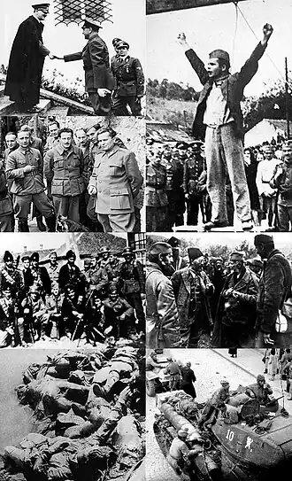 ![]() No sentido horário: Ante Pavelić encontra Adolf Hitler; Steva Filipović antes de sua morte; Draža Mihailović se dirige a seus homens; Soldados soviéticos em Belgrado; Vítimas em Jasenovac; Um grupo de soldados alemães; Josip Broz Tito com o Estado-Maior Supremo | |||||