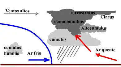 | Nuvens* | Frequentemente precedidas por cirrus, cirrostratus ou altostratus como uma frente quente (mas geralmente com quantidades menores dessas nuvens). Áreas de cirrocumulus e altocumulus dentro de cirrostratus e altostratus mais comumente vistas do que em uma frente quente. Nuvens cúmulos maiores sob os tipos de nuvens mais altas do que em uma frente quente, onde geralmente ocorrem estratocumulus e cúmulos humilis. Algumas dessas nuvens cúmulos podem produzir chuvas na frente. | Cumulonimbus e cumulus congestus produzindo chuvas frequentes, com uma camada de altostratus superior, através da qual o sol às vezes pode ser visto. Menos comumente, nimbostratus ocorre com chuva contínua. | Altocumulus irregular ou estratocumulus e nuvens cirrus superiores junto com stratus fractus de movimento rápido, e depois eventualmente cúmulos dispersos e às vezes cumulonimbus |