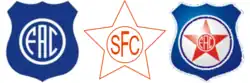 Na esquerda o escudo do Fluminense Atlético Clube, no meio o escudo do Serrano Futebol Clube e na direita uma versão antiga do escudo do Friburguense.