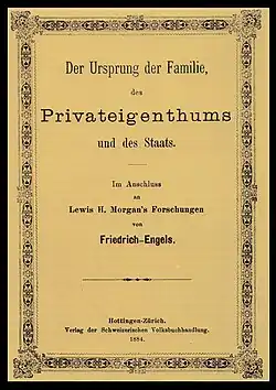 A Origem da Família, da Propriedade Privada e do Estado é uma obra que conecta o capitalismo com o que Engels afirma ser uma instituição em constante mudança - a família. Foi escrita quando Engels tinha 64 anos de idade. Ela contém uma visão histórica da família em relação a questões de classe, subjugação feminina e propriedade privada.