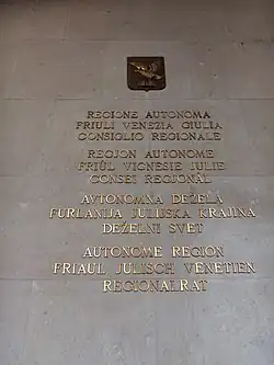 Placa em todas as línguas oficiais da região no Conselho Regional, em Trieste.