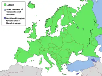 A definição moderna de Europa limita-a com a Ásia no mar Egeu, Dardanelos-mar de Mármara-Bósforo, mar Negro, tergos do Grande Cáucaso, parte noroeste do mar Cáspio e montes Urais, como exemplificam muitos atlas, entre os quais o publicado pela National Geographic Society, e listagens como as do CIA World Factbook.