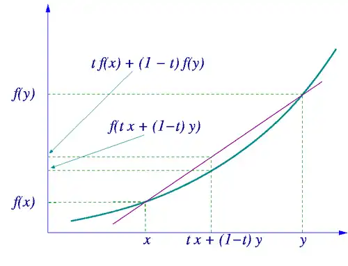 Ou seja, uma função é convexa se a imagem pela função de qualquer combinação convexa entre dois pontos do domínio resulte em um valor que é no máximo igual à combinação convexa das imagens desses pontos. Uma função diz-se estritamente convexa se, para quaisquer x e y pertencentes a [a,b] e para todo t ∈ (0,1), se tiver: