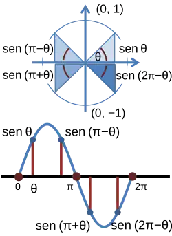 Como uma rotação de um ângulo de não altera a posição ou o tamanho de uma forma, os pontos A, B, C, D, e E são os mesmos para dois ângulos cuja diferença é um múltiplo inteiro de . Assim, as funções trigonométricas são funções periódicas com período . Ou seja, as igualdades