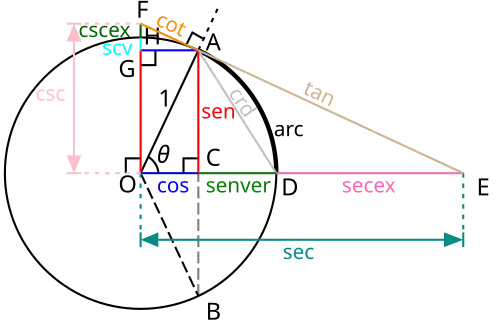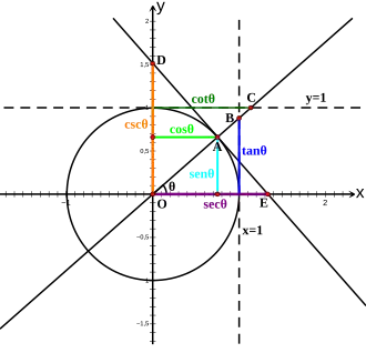 Seja o raio obtido pela rotação de um ângulo θ da metade positiva do eixo x (rotação anti-horária para , e rotação horária para ). Este raio intercepta o círculo unitário no ponto . O raio , estendido para uma reta se necessário, intercepta a reta da equação no ponto , e a reta da equação no ponto . A reta tangente ao círculo unitário no ponto A, é perpendicular a , e intercepta os eixos y e x nos pontos e . As coordenadas desses pontos fornecem os valores de todas as funções trigonométricas para qualquer valor real arbitrário de θ da seguinte maneira.