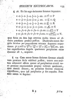 Onde é o Pi. Embora Euler conhecesse o início da sequência decimal , sua justificativa baseou-se em argumentos matemáticos e não em cálculos explícitos, já que a soma nunca termina. Assim, a função zeta fornece o resultado para a entrada 2. Analogamente, para a entrada 3, 4... etc., os inversos de todos os números cúbicos, números biquadrados etc. devem ser adicionados correspondentemente e novos limites , ... etc. surgem.