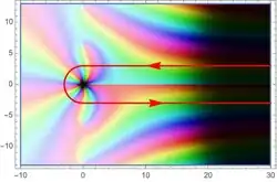 Agora define-se para a função como uma integral de contorno sobre . A curva escolhida vem de , corre a uma distância acima da reta real, contorna a origem em um semicírculo e então se estende novamente a uma distância abaixo da reta real em direção a :
