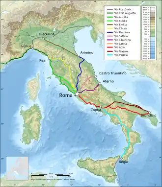 Roma cresceu na margem esquerda do rio Tibre, a cerca de 25 quilômetros de sua foz, num trecho navegável do rio, portanto com acesso fácil ao mar Tirreno. Esta região, de clima temperado, em vista da sua topografia acidentada, possui entre as colinas circundantes alguns importantes vales que, no processo de desenvolvimento da cidade, tornaram-se úteis para a mesma.[15][16] Além disso, por estes vales serem, no geral, vales vulcânicos, a produtividade do solo, em vista da presença de fertilizantes naturais como potássio e fosfatos, é elevada.[17] A cidade tinha as vantagens de uma posição ao mesmo tempo marítima e do interior.[18] Situada a cerca de 20 km das colinas Albanas, que constituem uma defesa natural, e numa planície suficientemente afastada do mar, a cidade não precisaria temer incursões dos piratas. Além disso, tanto o próprio rio (e a ilha Tiberina[nt 5]) como os montes Capitólio e Palatino operavam como cidadelas naturais facilmente defensáveis.[19][20]