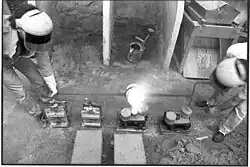- Após resfriado e solidificado, o material fundido é retirado do molde. Deve-se tomar cuidado para retirar a areia dos machos. A areia pode ser reaproveitada em outros moldes de fundição, desde que não esteja contaminada por nenhum elemento que cause reações indesejáveis.[1]